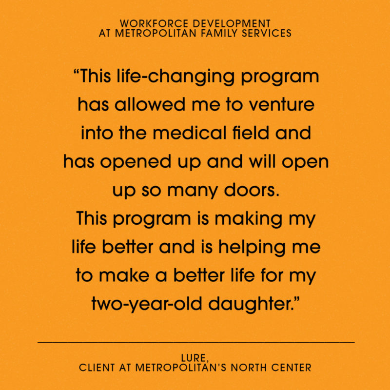 Through our partners at Chicago Community Learning Center, our staff connected Lure with a Patient Care Technician (PCT) training program.